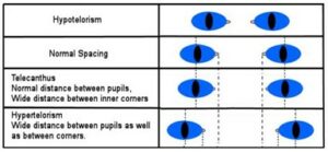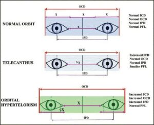 Hos mennesker er telecanthus definert som en økt avstand mellom medial canthis (ICD) og mindre PFL.